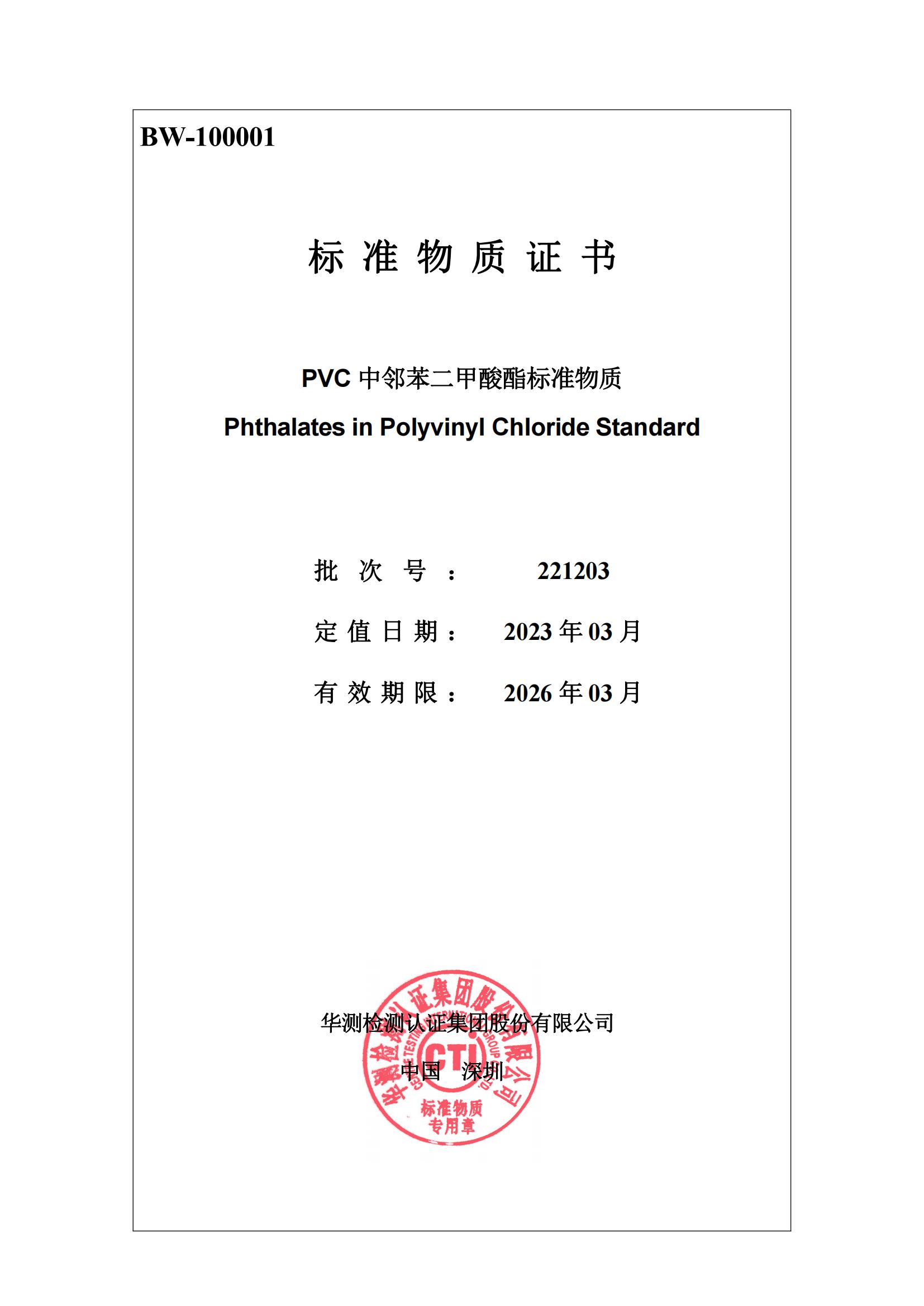 本标准物质由深圳市泓盛仪器设备有限公司与 CTI 华测检测联合定制。