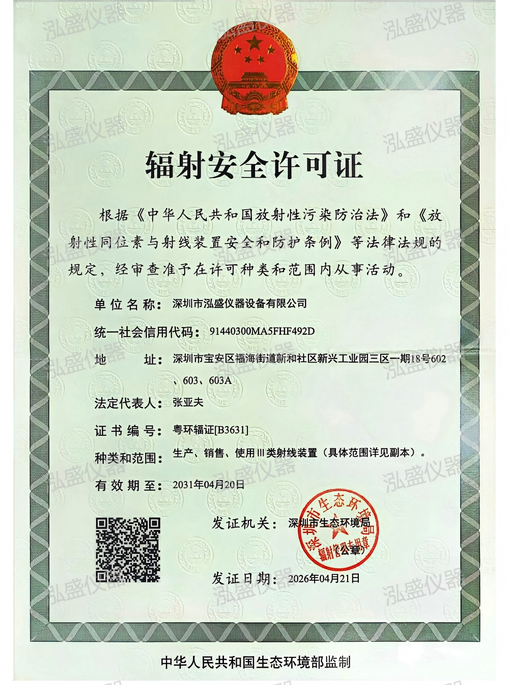 泓盛仪器2026年最新辐射安全许可证已经颁发,买泓盛rohs检测仪,放心使用。